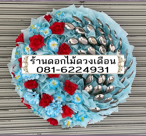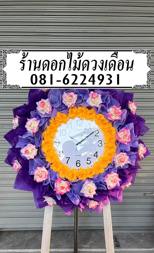 พวงหรีดช้อนโทนสีสดใส ตกแต่งสีเหลือง แซมด้วยดอกไม้แดงม่วง พร้อมบริการส่งถึงศาลาวัดในกรุงเทพฯและปริมณฑล
